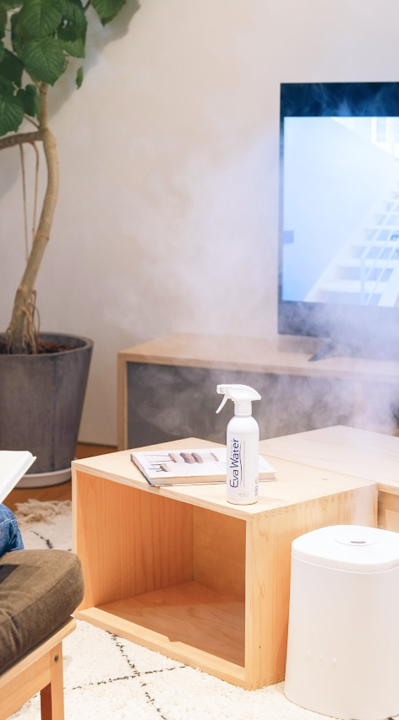 By spraying mists into the air through humidifier, Eva Water can kill viruses or neutralize odor in spaces shared by a group of people.